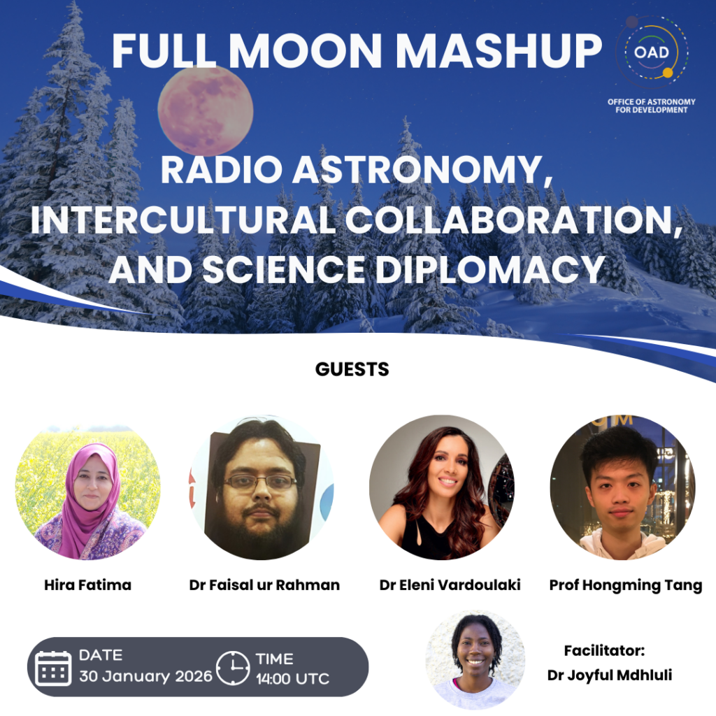We are excited to kickstart the 2026 Full Moon Mashup series with a conversation that explores how astronomy can connect cultures, strengthen international collaboration, and contribute to science diplomacy. How can astronomy bring people, cultures, and countries closer together? The next Astro4Dev Full Moon Mashup will explore this question by focusing on the international and […]